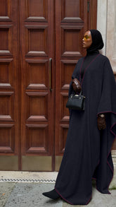 Elevate your look with this lightweight Black Wool cloak featuring sleek deep burgundy trim. Designed for multiple styling options, it can be worn draped, wrapped, or open for effortless layering. A timeless piece for modest fashion, travel, and everyday elegance.